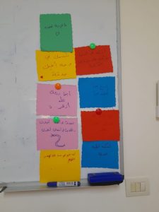 - Afterwards, I divided the learners into groups, and each group contemplated an image and projected it onto the topic of the meeting. Then, we discussed sincerity in work and its importance in religious courses. I followed this learning activity with an energizer where I distributed sticky notes to the trainees, and they wrote the first letter of their name with a positive attribute and posted it on the board so that we could read it and talk about it in a friendly atmosphere and a lot of fun.