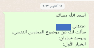 بطبيعة الحال، الطلبة يفضلون السؤال عبر الواتس أب، لأنه مُتاح في أي زمان ومكان، ولأنه بالنسبة لبعضهم أسهل من السؤال وجهًا لوجه، وهذا ما حدث فعلًا! الجميع سأل! حرفيًا الجميع يسأل ويرسل مختلف الموضوعات، فمنهم من يسأل عن مهمته، ومنهم من يسأل عن تغيبه، ومنهم من يسأل عن أدائه، وبدلًا من أنسخ الإجابات للجميع، أصبحت أفتتحها بأسمائهم: أهلًا وسهلًا، مرحبًا بك يا، وصباحك سعادة يا… وحرصت على تكرار اسم الطالبة في كل رسالة من قبلي.