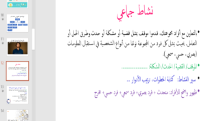 فيما يخص موضوع اللقاء والمعلومات التي تحتاج عرض قبل أن تكون نشاط، أصبحت أبحث قدر الإمكان عن مقاطع فيديو أو مقاطع اشتهرت أو لقاءات أو أخبار يوجد بها مضمون موضوعنا، وأصبحت المعلومات المكتوبة هي ملاذي الأخير إن التجأت إليه صممته على شكل خريطة مفاهيم أو رسم ذكي أو انفوجرافيك، وذلك في محاولة لإشباع أكبر قدر من الحواس لدى المتعلمين.