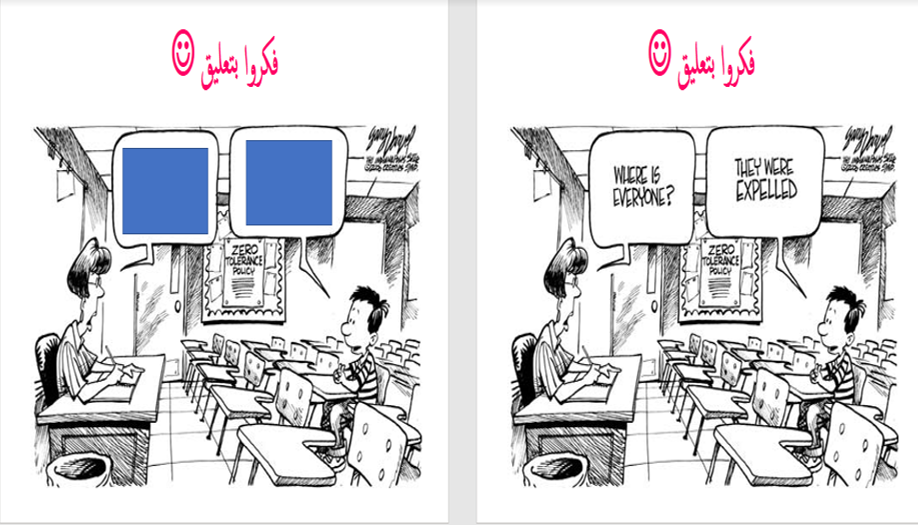 بعد تجربة التيسير أعدت تصميم جزء من العروض التقديمية، بحيث أني أضفت في بداية اللقاء دائمًا رسم ساخر (كاريكاتير) وأقوم بتغطية التعليق الذي يكتبه الرسام، وبقدر ما يكون الرسم مُضحكًا بقدر ما يكون مدخلًا لموضوع اللقاء اليوم، فهو يمثل تهيئة لجذب انتباههم ورؤيتهم للموضوع من زاوية لم يتوقعوها، فتبدأ المجموعات باقتراح التعليقات ويتم تشجيع كل مجموعة وبالنهاية يتم الكشف عن المُشارك الأخير وهو الرسام، والفكرة تتعلق بالوصول لاستنتاج أو تعليق أيًا يكن وليس بالوصول لتعليق الرسام نفسه.