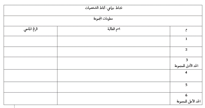 وفي اللقاء الذي يليه تم وضع النقاط على الحروف، هذه المرة دخلت بقائمة الملاحظة وطبعت أوراق النشاط بصفحة أولى فيها جدول لكتابة أسماء أفراد المجموعة مع عبارة الحد الأدنى عند الطالبة رقم 3 وعبارة الحد الأعلى عند الطالبة رقم 6، وتكونت المجموعات جميعها من خمس طالبات، وأصبحت بعد ذلك أطبع أوراق النشاط مع هذا الجدول دائمًا.