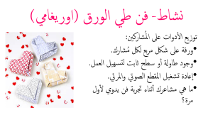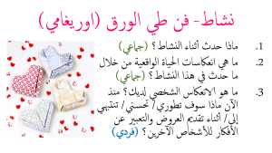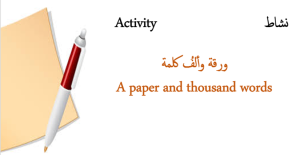 في موضوع التواصل الكتابي، قدمت لهم نشاط عبارة عن كتابة خاطرة، بحيث يكتب كل فرد كلمة أو 3 كلمات بحد أقصى ويتابع الفرد الذي يليه للبناء على ما كتبه من قبله، حتى يتكون لدينا في النهاية خاطرة معبرة رغم أن العديد شاركوا في كتابتها، ونشرت تلك الخواطر في مجلة المؤسسة في ذلك الشهر لأني كنت مشاركة في إعداد ذلك العدد، حتى إن إحدى الطالبات رسمت إلى جانب الكلمة التي كتبها قلبًا، وأضفته في المجلة كما رسمته.