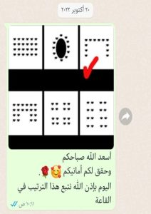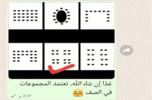 لم تكن جميع لقاءاتنا بالترتيب المعتاد للمجموعات، اقتطعت 10 دقائق من اللقاء لشرح الأوضاع المختلفة في الصف من أجل توظيفها في لقاءاتنا القادمة، وبعد ذلك أصبحت أُرسل لهم على مجموعة الواتس أب الوضع المحدد للقاء اليوم أو قبله بيوم.