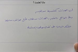 بعد التقويم الذاتي والتأمل بعد الانتهاء من الورشة استنتجت أني أحتاج أن أركز على عملية التدوين لأهم ما يذكر أثناء عملية التيسير، كمان إني وفقت في تحفيز المتعلمات على الربط بين النشاط وما تعلمناه منه وانعكاسه على الواقع في بيئة العمل مع مشاركة بعض التجارب لهن.
